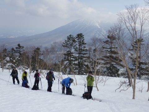 22日、八幡平の山行2日目にはスキー12名、歩行3名の14名が参加しました。御在所の駐車場から恵比寿森経由で茶臼岳を循環します。この日はすばらしい天気に恵まれました。