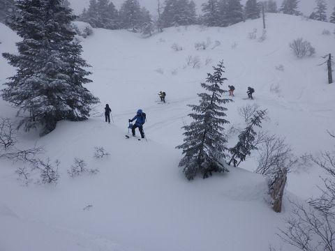 3月7日、会員7名。はからずも蔵王の西面・横川の源頭に滑り込んでしまった。登り返しは東面に比べるときつい。このルートをあえて選ぶならば入ナンバ沢を越えてLizaのスキー場に抜ける手はあるかもしれない。