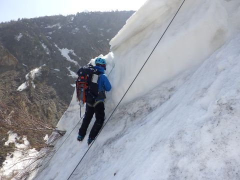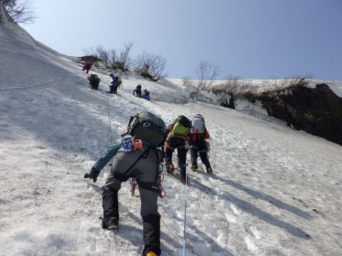 雪上訓練班の確保訓練。他にもつぼ足登下降、アイゼン登下降、雪洞構築など。
