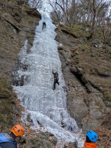 アイスクライミング班は8名。仙人沢のアイスガーデンで3本のルートを登り込んだ。ツアーのハイカーで賑わっていたが、クライマーの数はそれほど多くなかった。