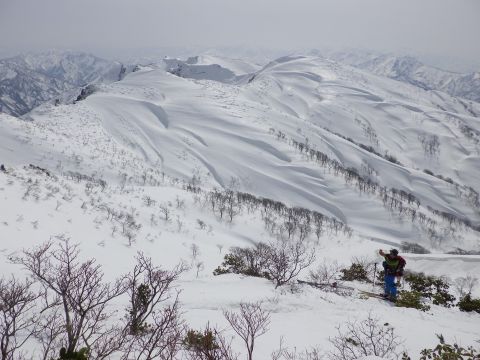 大僧森まで稜線を歩き、その後尾根を滑降。尾根上にトレースはありませんでしたが、登り返し地点には前日のものと思われる沢からのトレースがありました。
